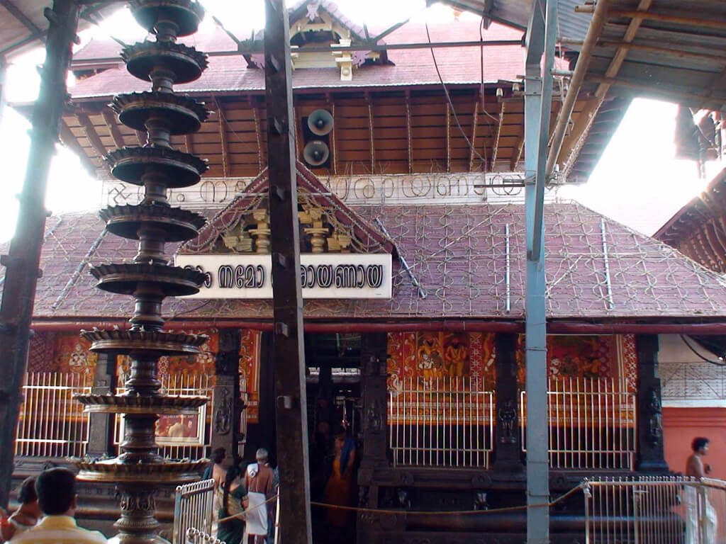 Guruvayur temple is the holy dwelling place of Lord Sri Krishna, where you find the paramount of divinity and worship. The idol of the deity here is believed to have some 5000 years of age. Though there is no candid evidence to substantiate this, there are ample references about 'Kuruvayur' in antique Dravidian literatures. However while relying on certain Dutch and British records related to the temple and the place, one could assume that the temple has been existing since 52 AD. With such long history of existence, the Guruvayur temple was also at the receiving end of the ebbs and flows of political advances. Attack by the Dutch in 1716, conquer by Hyder Ali in 1766 and the ravaging advance by Tipu Sultan in 1789 had left indelible scars on the monumental structure. Years after, it was an accidental fire in 1970 that destroyed many parts of the temple, but not the sanctum sanctorum of Lord Krishna and subordinate deities. That was an occasion when people irrespective of their caste, creed or religion joined together in dousing the fire and saving the temple. Today, the temple is an asylum of Krishna devotees who make long winding queues for getting a sight of the beloved deity. The deity here is in typical Lord Vishnu character with four hands, each one holding conch, wheel, club and lotus. The temple has got 101 bells made of silver and coated gold.